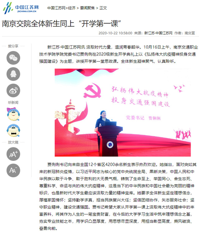 【中国江苏网】南京交院全体新生同上“开学第一课”