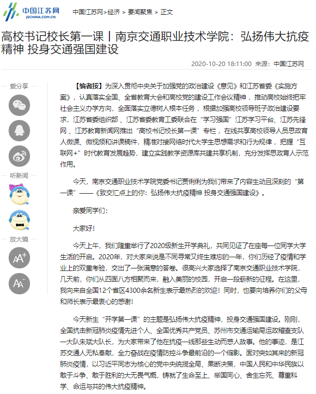 【中国江苏网】高校书记校长第一课丨南京交通职业技术学院:弘扬伟大抗疫精神 投身交通强国建设