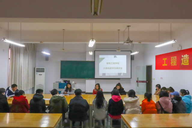 2020年12月16日,建筑工程学院在广宇楼415、416召开少数民族学生座谈会,建筑工程学院党总支书记陈晋中、党总支副书记唐喜芬,学院关工委副主任唐利国,学工办王珣老师、沈月老师、张东雪老师,以及建筑工程学院所有在校14个少数民族共48名少数民族学生参加会议,会议由学工办王珣老师主持。