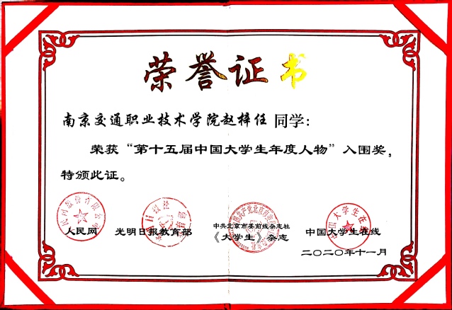 由教育部指导,人民日报社、光明日报教育部等有关部门主办的第十五届“中国大学生年度人物”推选展示活动结果揭晓。学院汽车营销181班赵梓任同学经过校级、省级层层推选,荣获“第十五届中国大学生年度人物”入围奖。