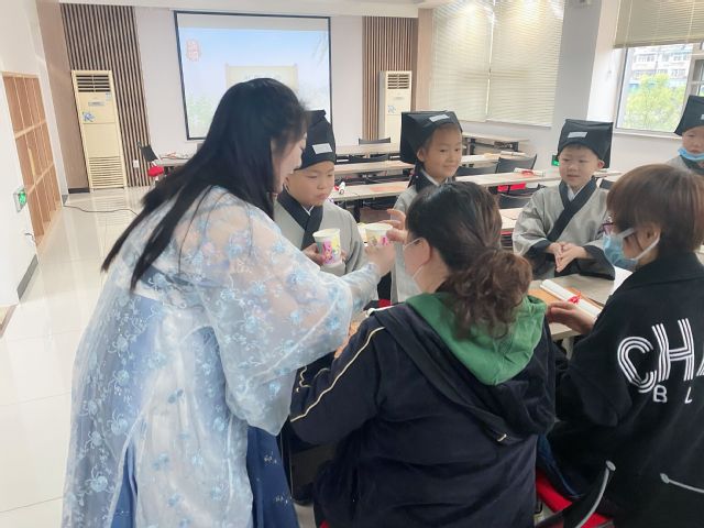 志愿者们帮助小朋友们一起穿上中华传统服饰,为小朋友们和家长们介绍了清明节的由来、习俗,重点讲述了清明节所承载的尊祖敬宗、祭祀亲孝、继志述事的精神文化。活动中,志愿者们还为小朋友们一一示范了传统敬茶的礼仪,教会小朋友们如何向父母长辈们敬茶,指导小朋友们礼绘“心”字,让小朋友们在画纸上描写心字,表达对父母的感恩之心,感受孝由“心”生,最后他们还带领小朋友们一起做礼仪功夫操,让小朋友们在肢体动作中体会中华传统礼仪。