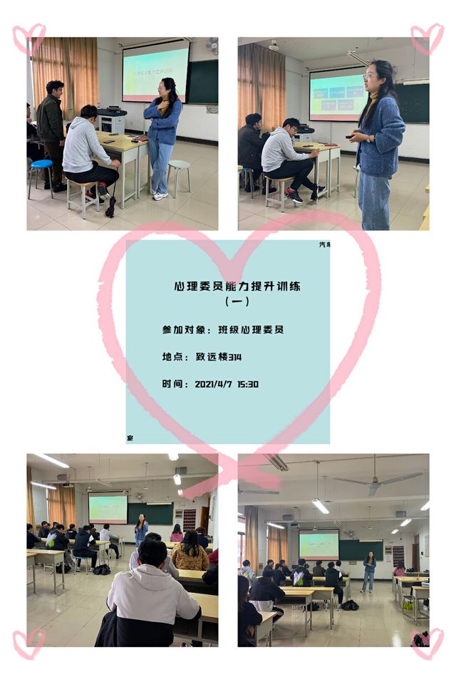 为了及时全面掌握各班级学生心理健康状况,提升班级心理委员的知识和技能水平,汽车工程学院组织开展心理委员能力提升系列训练活动,4月7日下午,由原心工作室戴萍老师主持的第一期心理委员能力提升训练在致远楼314开展,19、20级班级心理委员30余人参加。