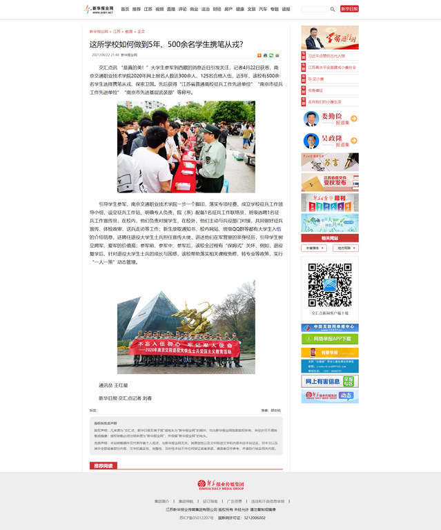 【新华报业网】这所学校如何做到5年、500余名学生携笔从戎?