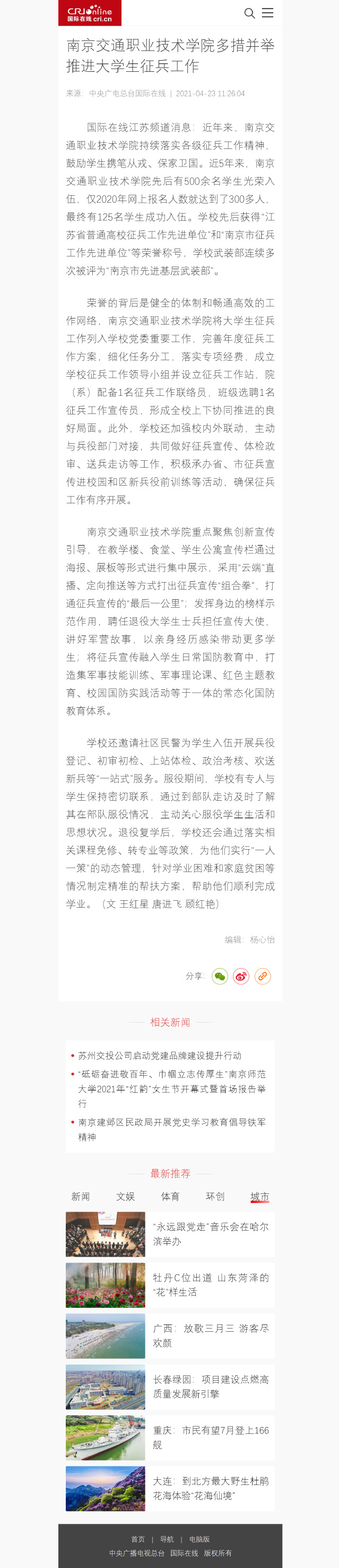 【中央广电总台国际在线】南京交通职业技术学院多措并举推进大学生征兵工作