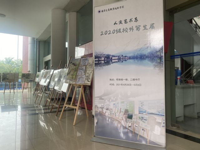 4月28日,人文艺术系2020级同学校外写生展在明德楼一楼与二楼大厅开展。