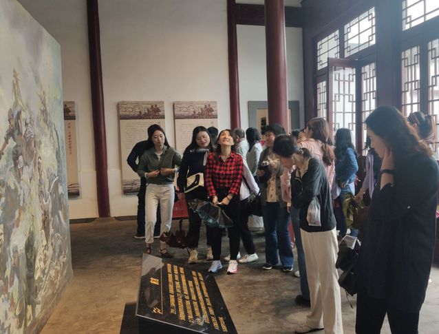 横山县抗日民主政府旧址位于江宁区横溪街道呈村,该旧址原为一大地主的住宅。该村位处低山丘陵,地势由西南向东北倾斜。横山盘踞于南面,峰峦层叠,沟壑纵横。抗日战争时期,新四军就是在此开辟根据地。纪念馆内陈展了抗日战争时期新四军曾使用过的作战服、战斗武器、作战地图等史料。我们一行人满怀敬意,或驻足观看,或凝神静思,或低声交流。那一件件锈迹斑驳的旧武器、一张张泛黄的老照片把大家的思绪又带回到了几十年前硝烟弥漫,厮杀震天的抗日战场,让大家深刻感悟到革命先烈舍生忘死、无畏牺牲的伟大精神。