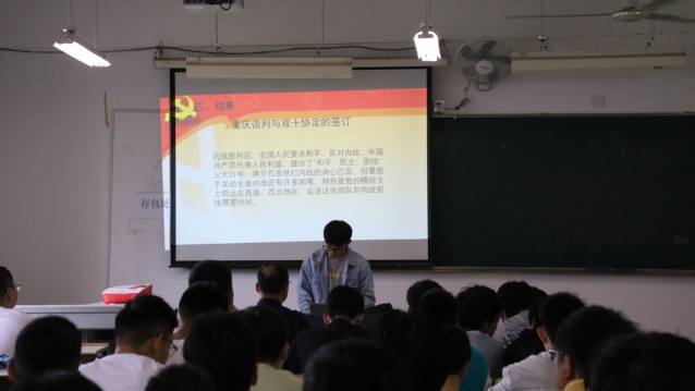 许强同学首先讲述了重庆谈判的历史事件,在日本宣布无条件投降后,为了避免内战、争取和平,1945年8月29日至10月10日,中国共产党同国民党政府在重庆进行了为期43天的和平谈判。