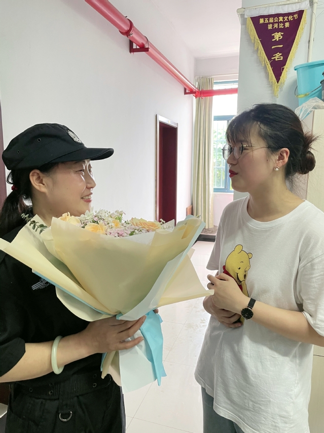 毕业生党员将提前精心准备的花束和贺卡送至学校公寓管理中心和所在楼栋宿舍管理办公室。他们纷纷表示:清晨,宿管阿姨为我们开关楼门、清扫楼栋大厅、例行检查卫生。晚上,与大家在微信互动聊天,叮嘱我们注意天气变化、适当增减衣物;提醒我们注意寝室安全,保管好个人财务;告诫我们安全用电,防范意外……这些至今历历在目。
