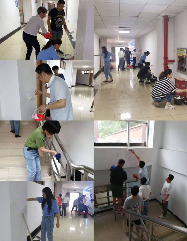 下午党员集合之后,协调分工,明确任务,活动有序开展。同志们根据活动前的学习,按照墙面基层清理、防裂处理、刷涂料、现场保护和清理几个环节稳步开展。经过大家的共同努力,在热闹欢快的氛围中完成了明志楼二楼楼梯及整个二楼走廊墙面的翻新工作,同志们在挥汗如雨的实干中收获了满满的幸福感和成就感。