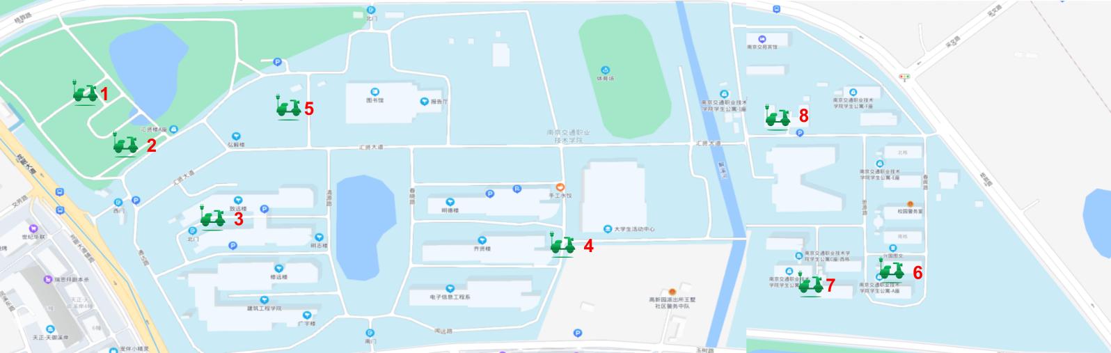校内共计建设16台智能充电站,提供160个充电端口,充电站位置分布如下(见附图)