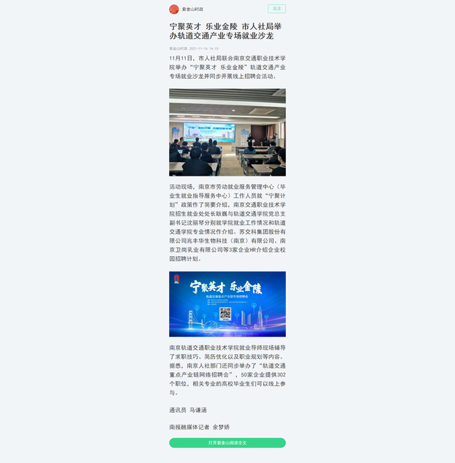 【紫金山时政】宁聚英才 乐业金陵 市人社局举办轨道交通产业专场就业沙龙