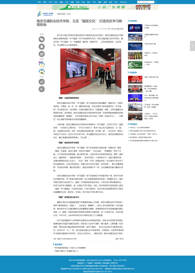 【中国江苏网】南京交通职业技术学院:立足“强国文化” 打造党史学习教育阵地