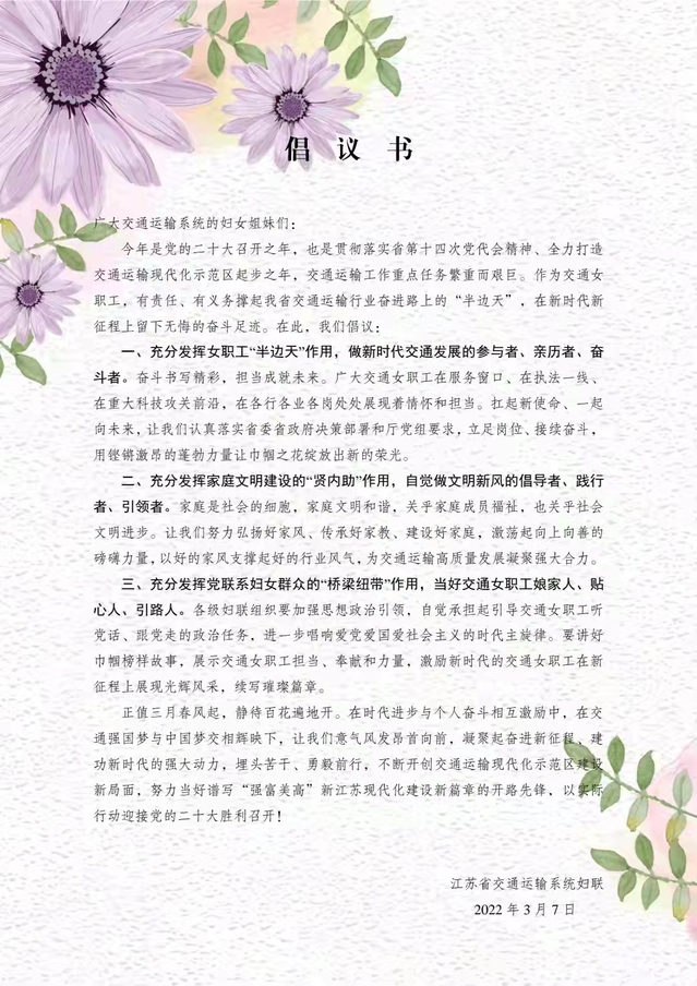 江苏省交通运输系统妇联致广大妇女姐妹们的倡议书