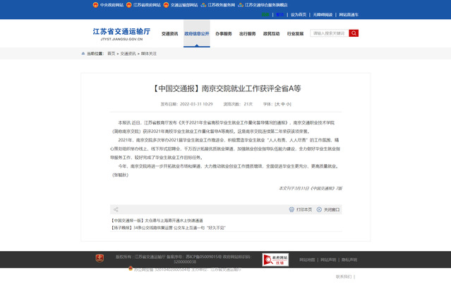 【江苏省交通运输厅官网】南京交院就业工作获评全省A等