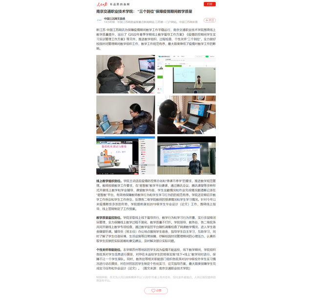 【人民日报·人民数字】南京交通职业技术学院: “三个到位”保障疫情期间教学质量