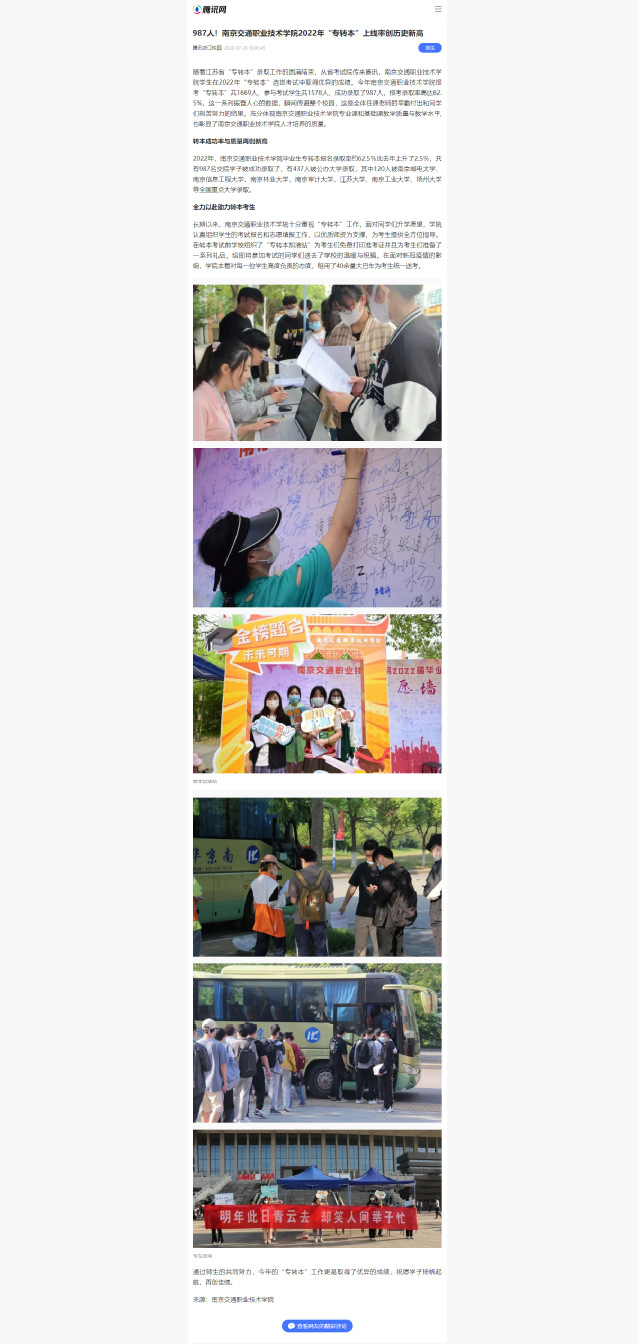 【腾讯网】987人!南京交通职业技术学院2022年“专转本”上线率创历史新高