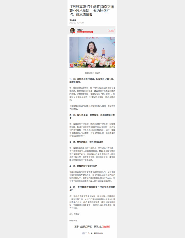 【紫牛新闻】江苏好高职·招生问答|南京交通职业技术学院: 省内计划扩招,首志愿填报