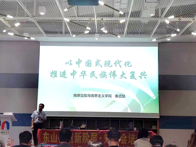 为全面深入学习宣传贯彻党的二十大精神,切实提高党外人士的政治理论素养和综合能力,坚定党外人士接受中国共产党领导的政治自觉、思想自觉和行动自觉,以奋勇争先的良好姿态推进工作,充分发挥新的社会阶层联合会的先锋带头作用,2023年9月21日 江宁区东山街道举办《新阶层·知联会》培训活动。马克思主义学院秦志凯副教授受邀做了《以中国式现代化推进中华民族伟大复兴》的专题报告。