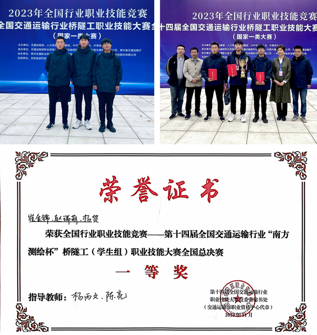 10月29日—11月4日,由交通运输部、人社部、中华总工会、共青团中央等四部委联合主办的全国一类大赛——第十四届全国交通运输行业“升拓杯”桥隧工(职工组)、“南方测绘杯”桥隧工(学生组)职业技能大赛全国总决赛在贵州交通职业技术学院举行。经过激烈角逐,路桥与港航工程学院杨贺、崔金锦、赵瑞萌三位同学,在杨丙文和陈亮老师指导下,凭借出色的创新思维和扎实的技能功底,成功获得学生组团体一等奖的好成绩。