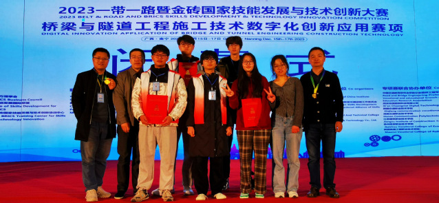 12月14日-17日,2023年一带一路暨金砖国家技能发展与技术创新大赛(桥梁与隧道工程施工技术数字化创新应用赛项)在广西南宁举行,经过激烈角逐,学校路桥与港航工程学院学生许鑫、薛善文、刘昌凡荣获一等奖第一名,王正婷、殷统菲、高增尧获一等奖第三名,朱俊、叶涛、孙亭亭老师荣获优秀指导老师,学院获最佳组织奖。