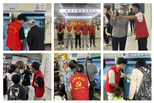 轨道交通学院学生们依托南京南站爱心小屋,提供“便民服务”,每次服务时长四个小时,身穿醒目的红色马甲的志愿者们活跃在南京南站的各个角落。志愿者们主要负责:帮助乘客购买火车票、寄存行李、指引方向、维持车站秩序以及帮助行动不便的老年人和残疾人进站等。他们耐心解答乘客的各种疑问,解决了一系列实际问题,真正地做到站好每一班岗,服务好每一位旅客。