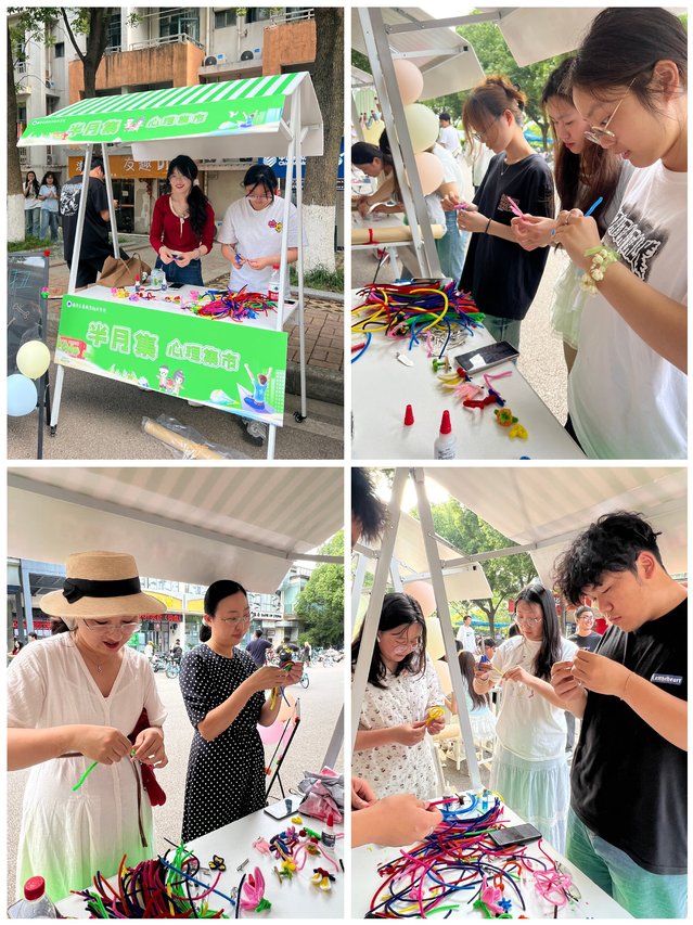 为推进心理健康教育与美育融合,营造健康温馨的校园氛围,6月4日下午,电子信息工程学院在学校一食堂门口举办了一场名为“半月集”的心理美育集市活动。学院结合美育理念与学生心理需求,设置三个互动体验区,引导学生悦纳自我、释放压力、感受美好。