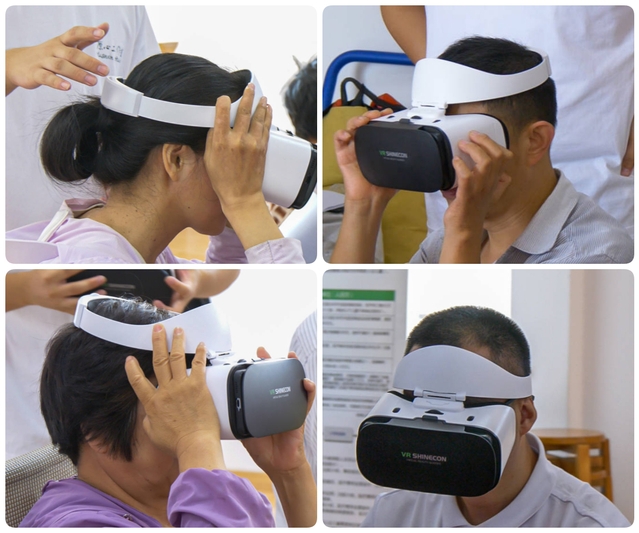 为打破空间阻隔带来的心灵封闭,实践团创新开展“虚实焕心之旅”。借助VR技术,实践成员们为残障朋友打造了沉浸式虚拟世界:黄山云海在眼前翻涌,故宫朱墙在光影中流转,热闹的市集声在耳畔回响。当一位脑部损伤的大哥戴上设备后,一直反复说着“好!”这场“见山见水见世界”的体验,虽只是一次短暂的心灵触碰,却在虚拟与现实的交织中,为他们对外部世界的探索渴望增添了一份回应。