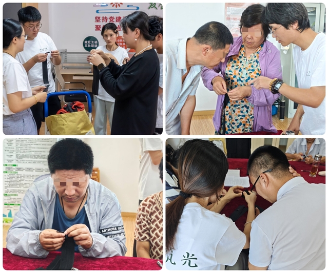 夕阳西下,实践活动已近尾声,此时早已过了残疾人平日回家的时间。不少人的口袋里响起家人催促吃饭的电话,一遍又一遍的铃声里,是寻常生活的烟火气,却拦不住他们频频回头的脚步。小吴攥着刚学会安装的拉链成品,把它悄悄塞进一位同学手里;老李用不太清晰的发音重复着“再来”;张阿姨颤巍巍地挥手,目光始终追随着忙碌收拾设备的同学们。那句“希望你们下次再来”,在暮色中轻轻飘荡,带着沉甸甸的期盼。