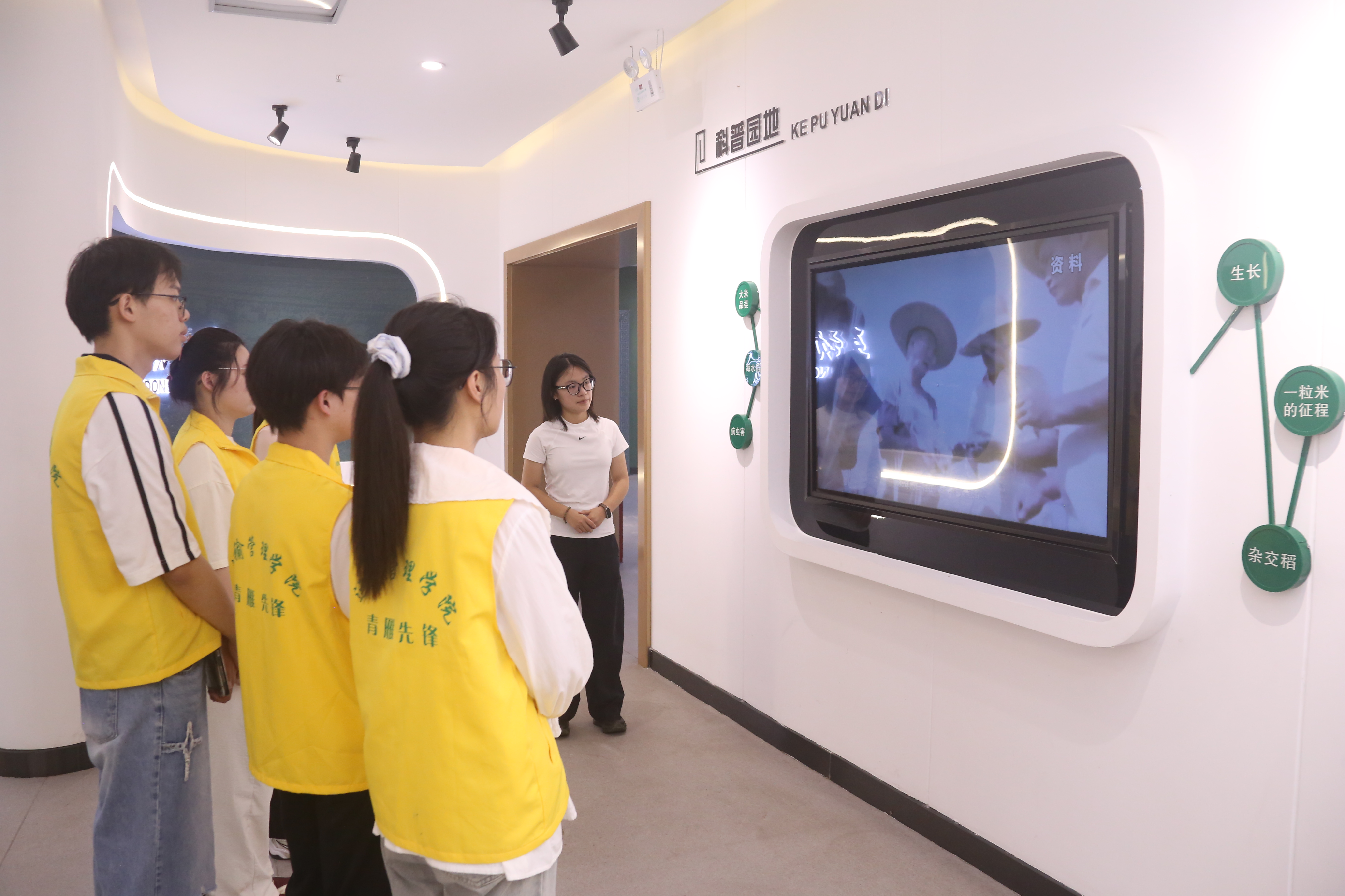 在研耕基地的湖熟稻米文化馆内,实践团成员沿着稻作发展的历史长河深入探访。从史前粗放耕作遗迹,到明清精耕细作图谱,一件件承载时光的农具实物,无声诉说着土地与汗水的故事,令同学们为先民的智慧结晶由衷赞叹。馆内,研学少年们在老师引导下,通过视频讲解、AR互动游戏与亲手触摸,沉浸式学习稻米形态演变、生长规律与种植技艺。“春种一粒粟,秋收万颗子”的虚拟体验,将粮食的珍贵与农事的艰辛深深烙印于每个人心中。同时,实践团还深入学习了如何运用现代科技进行绿色防治、实现智慧化和可控化的农业生产管理方式。