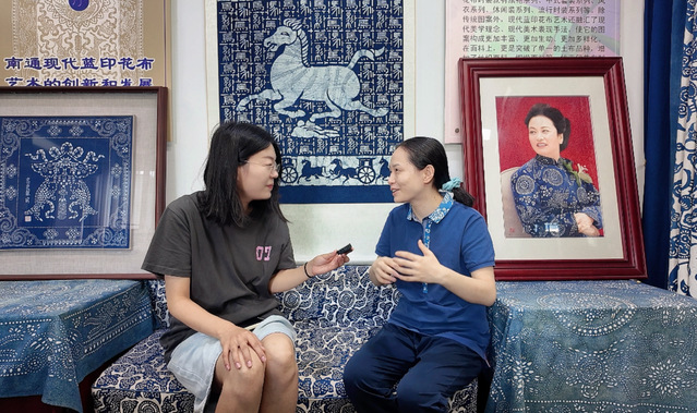 最后,实践团有幸采访到了南通大学蓝印花布艺术研究院院长、南通蓝印花布博物馆馆长、省级非遗传承人、崇川区文联副主席吴灵姝女士。她向我们介绍了南通蓝印花布的发展历史,展示了蓝印花布的传统纹样,分享了信息技术在南通蓝印花布保护与发展中的重要作用,以及蓝印花布制作在培育积极心理品质方面的独特作用。