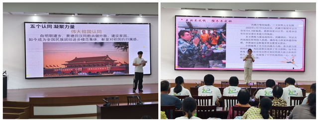 实践团成员周涛、陈佳慧分别进行了题为《同心共筑中国梦,石榴花开菱塘情》《丝路连心,民族团结》的宣讲,菱塘回族乡清真村多名乡亲参加了宣讲活动。宣讲后,同学们还为乡亲们演唱民族歌曲《茉莉花》、朗诵现代诗《沁园春·民族团结》,外国留学生也积极上台,用母语向乡亲们问好。现场气氛热烈融洽,充满欢声笑语。