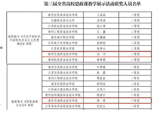 近日,江苏省教育厅公布第三届全省高校思政课教学展示活动获奖名单,我院徐青、刘冰两位教师分获高职高专《思想道德与法治》课程组、《习近平新时代中国特色社会主义思想概论》课程组二等奖。