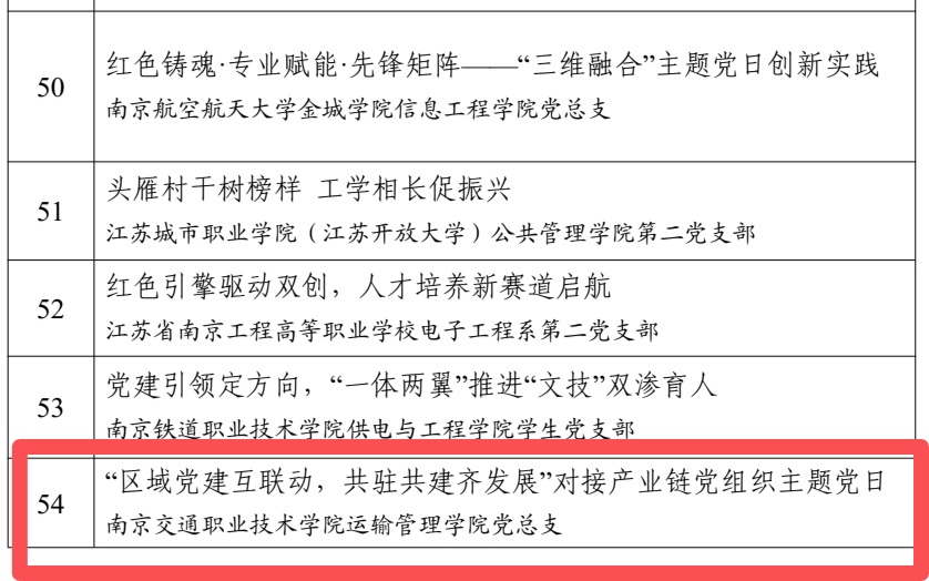 近日,江苏高校党建工作创新案例名单揭晓《省委教育工委关于公布 2023—2024 年度江苏高校党建工作创新案例名单的通知》(苏委教组函〔2025〕39 号),运输管理学院党总支申报的《“区域党建互联动,共驻共建齐发展”对接产业链党组织主题党日》案例荣获2023-2024年度江苏高校党建工作创新案例三等奖。