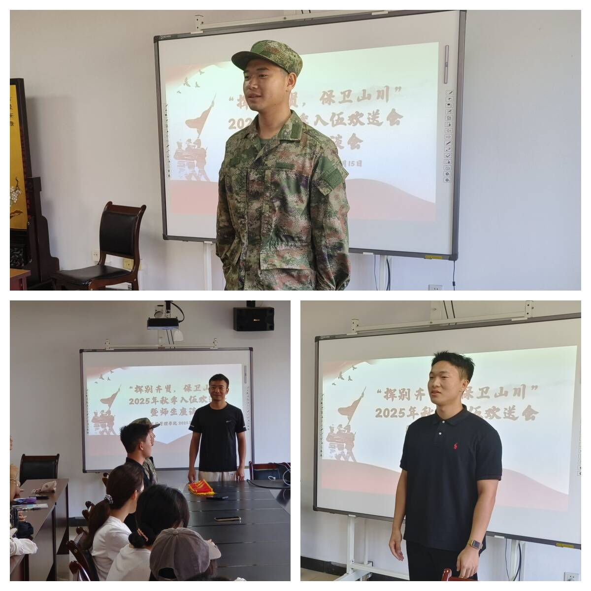 上午9时,欢送会在激昂的《中国人民解放军军歌》旋律中拉开帷幕。主持人首先介绍了本次欢送会的背景与意义,入伍同学张轩分享了自己从萌生参军想法到顺利通过体检、政审的全过程,言语间满是对军营生活的向往与期待。班主任肖老师对学子们过往表现表示肯定,他表示,无论在军营中遇到什么问题,都可以随时与学校、老师联系,学院会一直关心其成长与发展,班主任永远是其坚强的“后盾”。