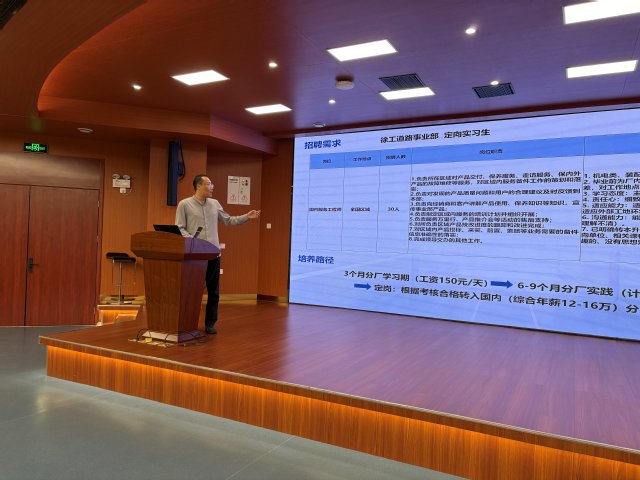 道路机械事业部李部长则聚焦本次招聘的具体需求,系统介绍了招聘岗位的工作职责、任职要求、薪酬福利体系、职业发展通道以及完善的培养模式。在互动环节,同学们就工作地点、晋升机制、面试流程等关切问题踊跃提问,李部长一一给予了细致耐心的解答,现场气氛热烈融洽。