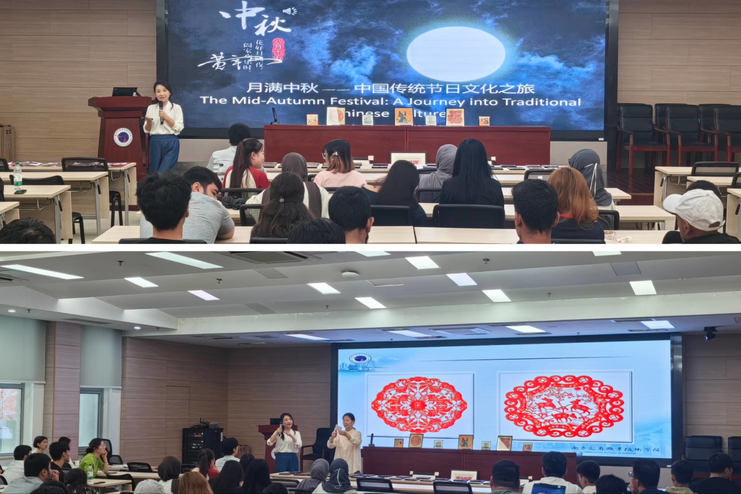 9月29日下午,国际教育学院精心策划并组织全体在校留学生开展了“中秋文化知多少”主题活动暨剪纸艺术体验课,讲座和体验活动由南京剪纸非遗传承人应家玲老师、留学生班主任基础教学部袁夕娣老师联袂开展,留学生班主任、第二班主任、全体留学生参加活动。活动由国际教育学院副院长扈凝主持。