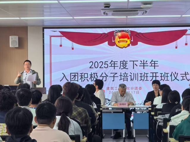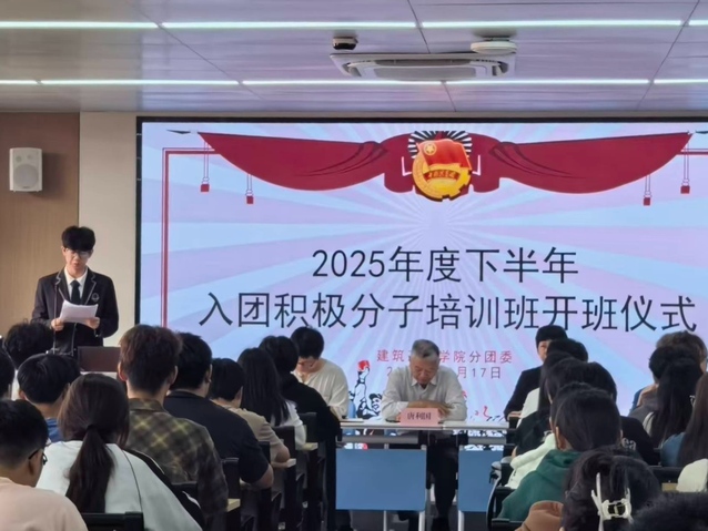 10月17日,建筑工程学院分团委2025年度下半年入团积极分子培训班开班仪式在学院502教室举行。学院党总支书记张丽君、副书记彭涌涛、关工委常务副主任唐利国、学工办主任杨步、分团委老师及全体新一期入团积极分子参加。
