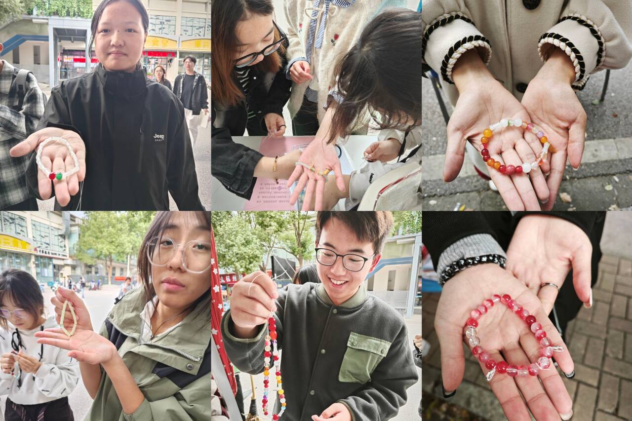 活动现场设置了融合传统文化与心理疗愈的互动环节。在“巧手制鱼灯,非遗润心灵”区域,同学们亲手扎制鱼灯,感受非遗技艺中蕴含的专注与宁静;“落叶拼贴画”环节鼓励大家收集秋日落叶,创作独一无二的自然画卷,在拼接中释放压力;而“果韵琉璃手机链DIY”则通过串珠搭配,引导学生沉心静气,体验手工编织的成就感。活动现场欢声不断,许多同学表示,在动手过程中“忘记了烦恼,找到了内心的平静”。