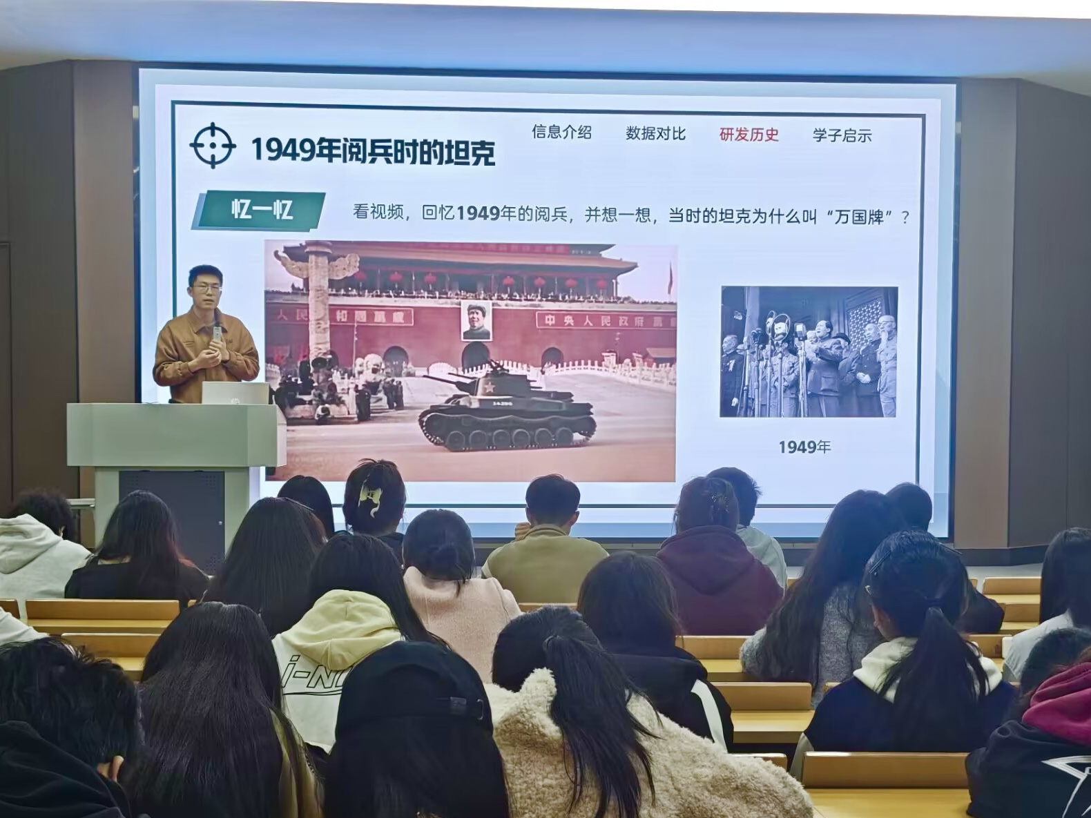 主讲人杨涛老师首先介绍了99A式主战坦克、GL - 6主动防御系统,阐述它们对我国国防现代化产生的深刻积极影响,有力证明了我国国防工业体系的完备性以及强大的创新能力,极大地激发了全体入团积极分子的民族自豪感与爱国热情。