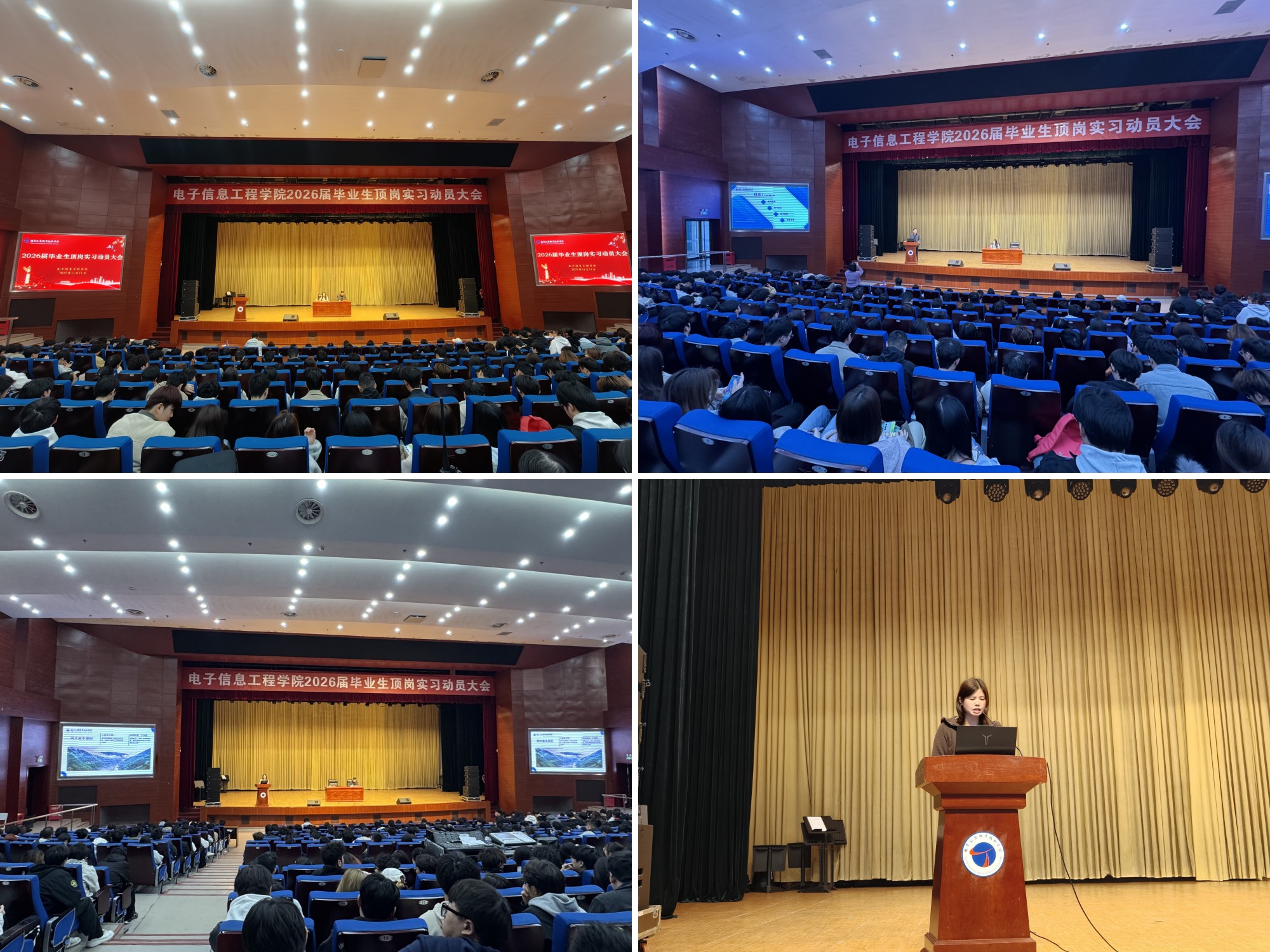 为进一步加强顶岗实习期间的教学和学生管理工作,11月11日下午,电子信息工程学院于图书馆报告厅召开了2026届毕业生顶岗实习动员大会。电子信息工程学院相关老师、2023级辅导员及全体学生参加了大会,会议由学院党总支副书记吴蓉蓉主持。