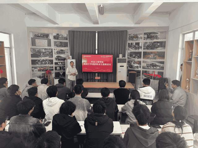汽车工程学院于2025年11月12日在B栋“大车以载”一站式学生社区成功举办了“我的大学我的职业生涯路”主题分享会。毕业十年的校友张鹏程重返母校,与学弟学妹们分享了个人成长经历,吸引了50余名在校学生积极参与。