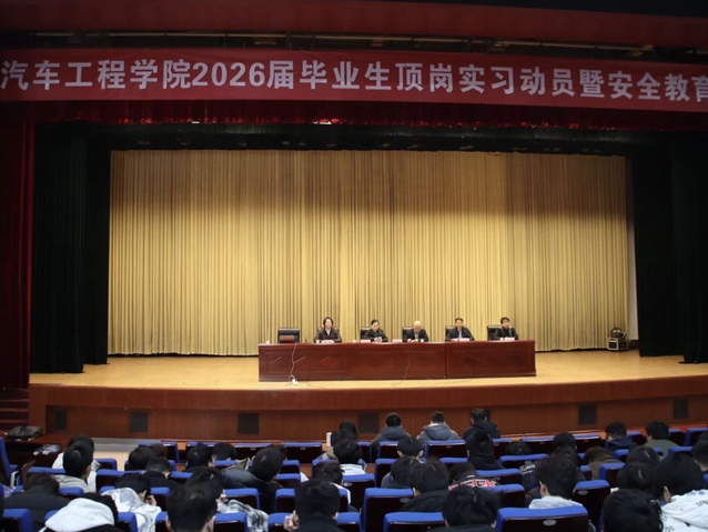 2025年11月21日上午,汽车工程学院在图书馆报告厅召开2026届毕业生顶岗实习动员暨安全教育大会,旨在帮助同学们明确实习目标、强化安全意识,为即将开始的实习生活做好充分准备。学院领导班子成员、保卫处处长周家明、图书馆高海燕老师、2023级班主任、辅导员及2026届全体毕业生参加会议。会议由刘阳书记主持。