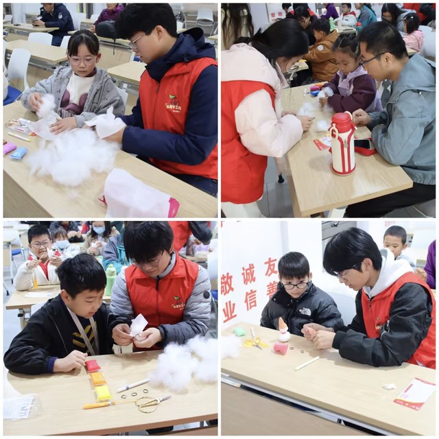 手工制作环节中,志愿者与孩子们携手合作,利用洗脸巾、棉花、橡皮泥等材料,一步步制作出各具特色的小雪人。过程中,志愿者们耐心指导、细致协助,不仅锻炼了沟通与实操能力,更在亲切互动中传递了关怀与鼓励。活动不仅提升了孩子们的创造力和动手能力,也为志愿者提供了践行公益、服务社会的实践平台,体现出资助育人工作室“受助-自助-助人”的良性循环理念。