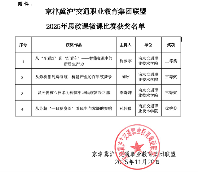 近日,京津冀沪+交通职业教育集团联盟正式公布2025年思政微课比赛获奖名单,我院选送的4件作品表现优异,荣登榜单。其中,许梦宇老师荣获二等奖,刘冰老师、李奇珅老师分获三等奖,孙伟薇老师获得优秀奖。