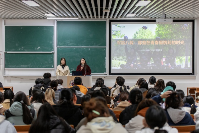 近日,艺术设计学院举办征兵宣讲活动,特邀曾在北京昌平武警某支队服役八年、现就读于艺术设计学院视觉传达2402班的宋梦霜同学,以自身成长经历为在场学生讲解征兵流程、讲述军营故事,点燃广大同学的参军热情。