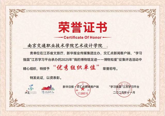 近日,在由江苏省文化和旅游厅、新华报业传媒集团联合主办,交汇点新闻客户端、“学习强国”江苏学习平台具体承办的2025年“我的博物馆足迹——博物知星”征集评选活动中,艺术设计学院凭借精心组织与深度参与,被授予“优秀组织单位”荣誉称号。