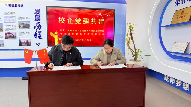 随后,双方举行了支部共建启动仪式暨合作框架协议签约仪式。江苏通用路桥工程有限公司总经理李煜与路桥与港航工程学院第二党支部书记陈姣姣共同签署《党支部结对共建协议书》,标志着双方正式建立长期、紧密、务实的党建与业务协作关系。
