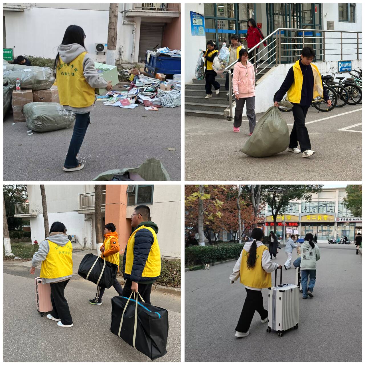 活动当天,志愿者们早早集合,分工明确、配合默契,协助大三同学将行李从宿舍楼搬运至校门口或指定装车点。尽管天气寒冷,但志愿者们热情高涨,主动帮助行动不便的同学打包、搬运大件行李,确保离校工作有序高效进行。