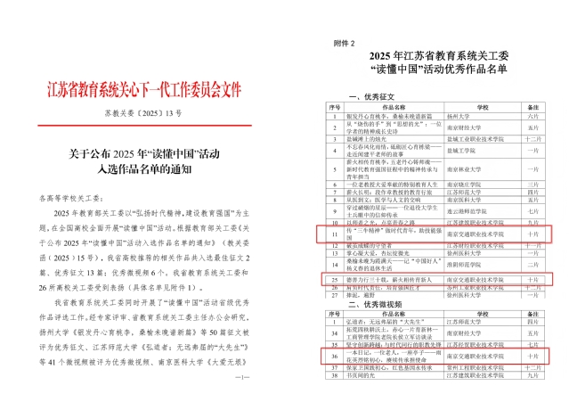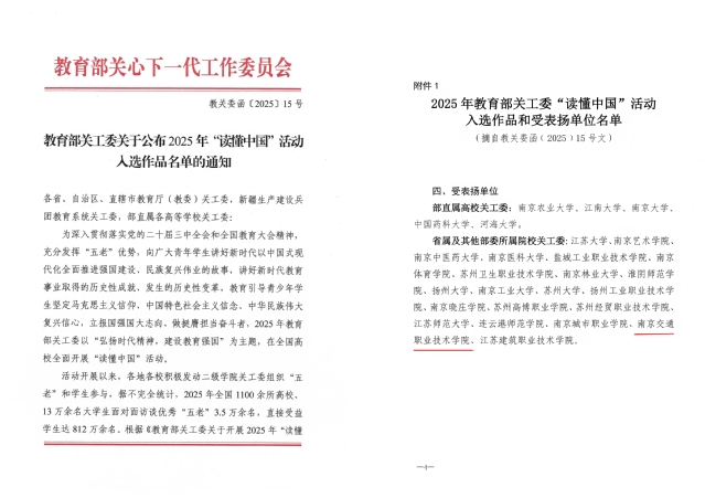 近日,教育部关工委、江苏省教育系统关工委相继公布2025年“读懂中国”活动评选结果,我校推荐的征文与微视频作品在省级评选中获多项荣誉——优秀征文奖2篇(全省共评出优秀征文奖50篇)、优秀微视频奖1部(全省共评出微视频奖41部)。凭借优秀的组织成效与作品质量,我校获得教育部关工委的表彰。