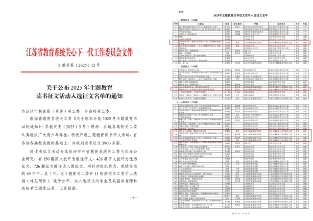 江苏省教育系统关心下一代工作委员会公布了“2025年主题教育读书征文活动”入选征文名单,我校共有6篇征文入选,其中最佳征文1篇,优秀征文1篇,入围征文4篇。